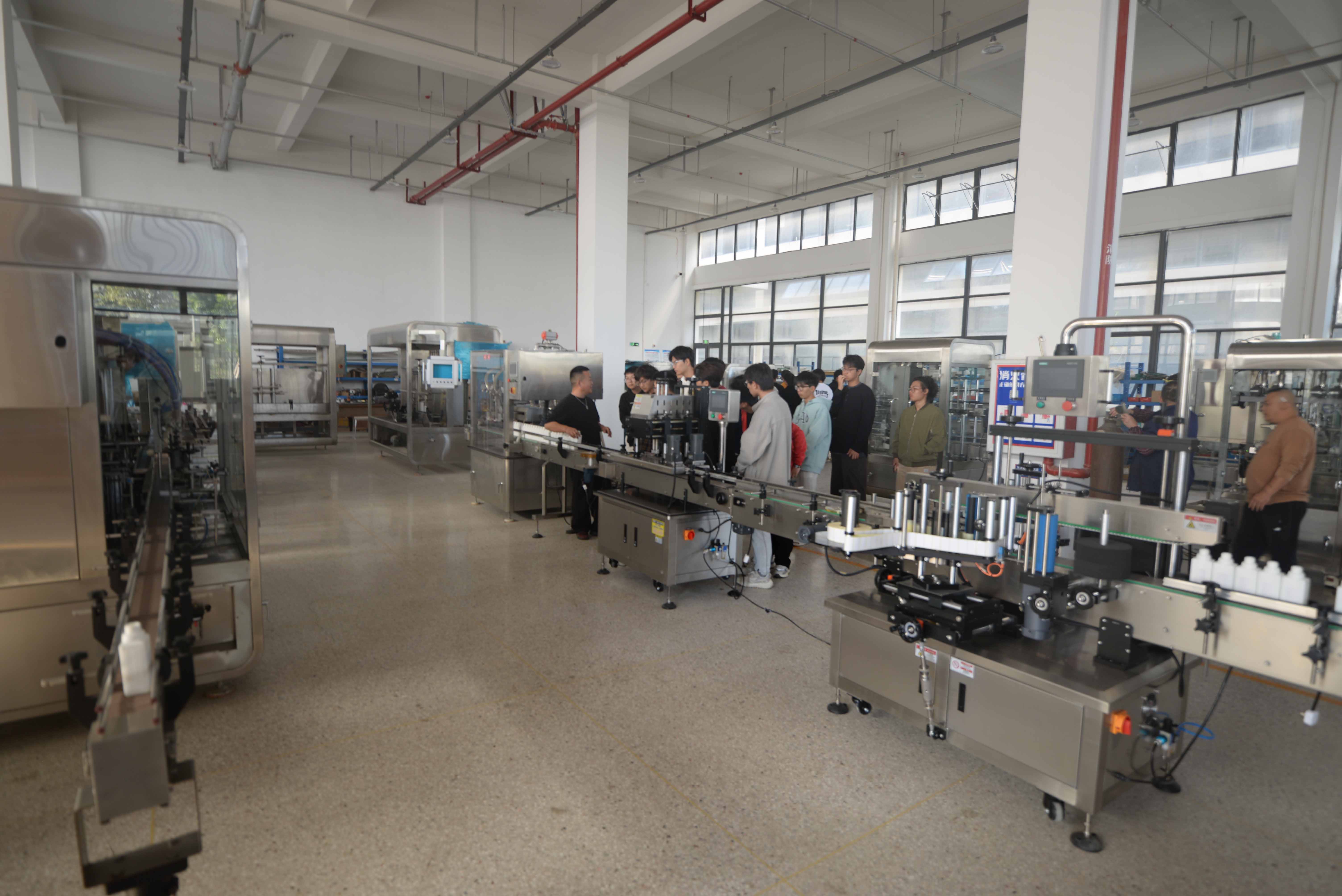 首先,學(xué)生們參觀了通用灌裝機(jī)的生產(chǎn)車間。中環(huán)智能的灌裝機(jī)廣泛應(yīng)用于食品、化妝品和藥品等多個(gè)行業(yè),設(shè)備自動化程度高,具有高效、精準(zhǔn)的特點(diǎn)。在現(xiàn)場,學(xué)生們看到灌裝機(jī)流暢而穩(wěn)定地將液體注入瓶中,并精準(zhǔn)控制灌裝量,減少浪費(fèi)的同時(shí)提高了生產(chǎn)效率。這種高效、精密的機(jī)械設(shè)備激發(fā)了同學(xué)們對技術(shù)創(chuàng)新的興趣,讓他們感受到機(jī)械制造的細(xì)致與嚴(yán)謹(jǐn)。